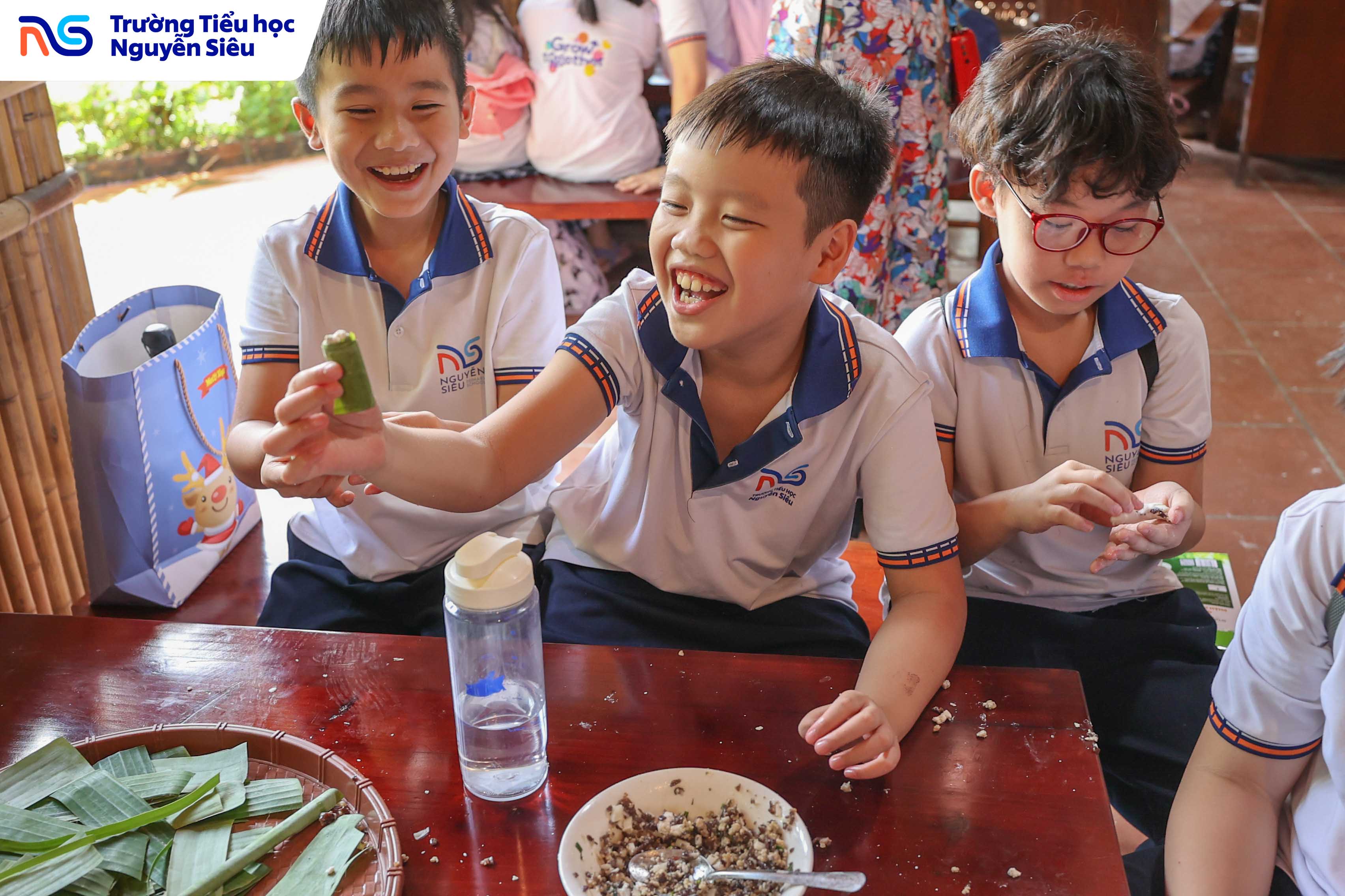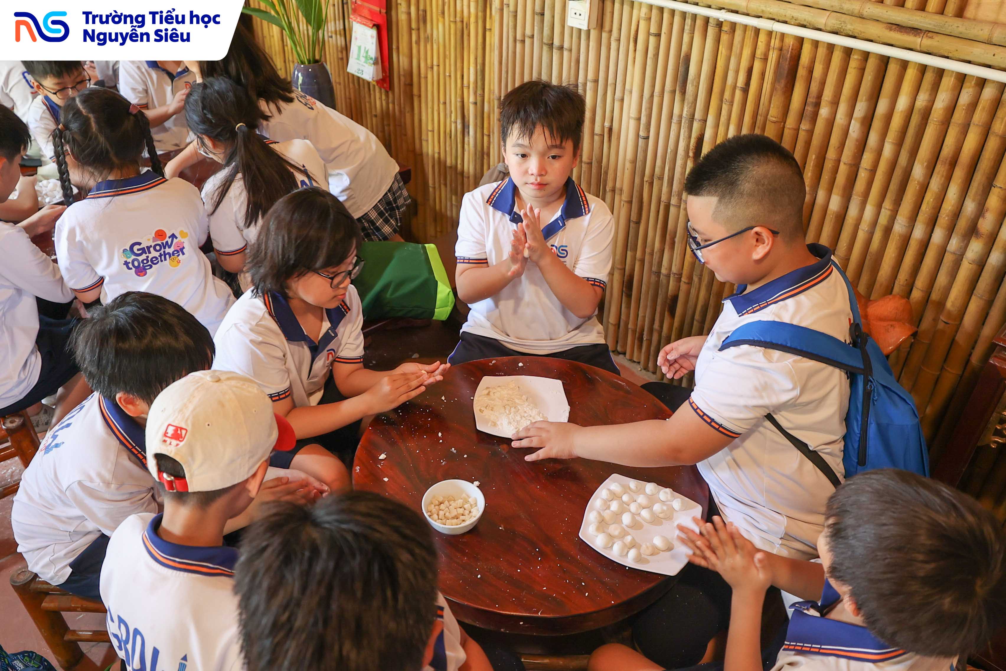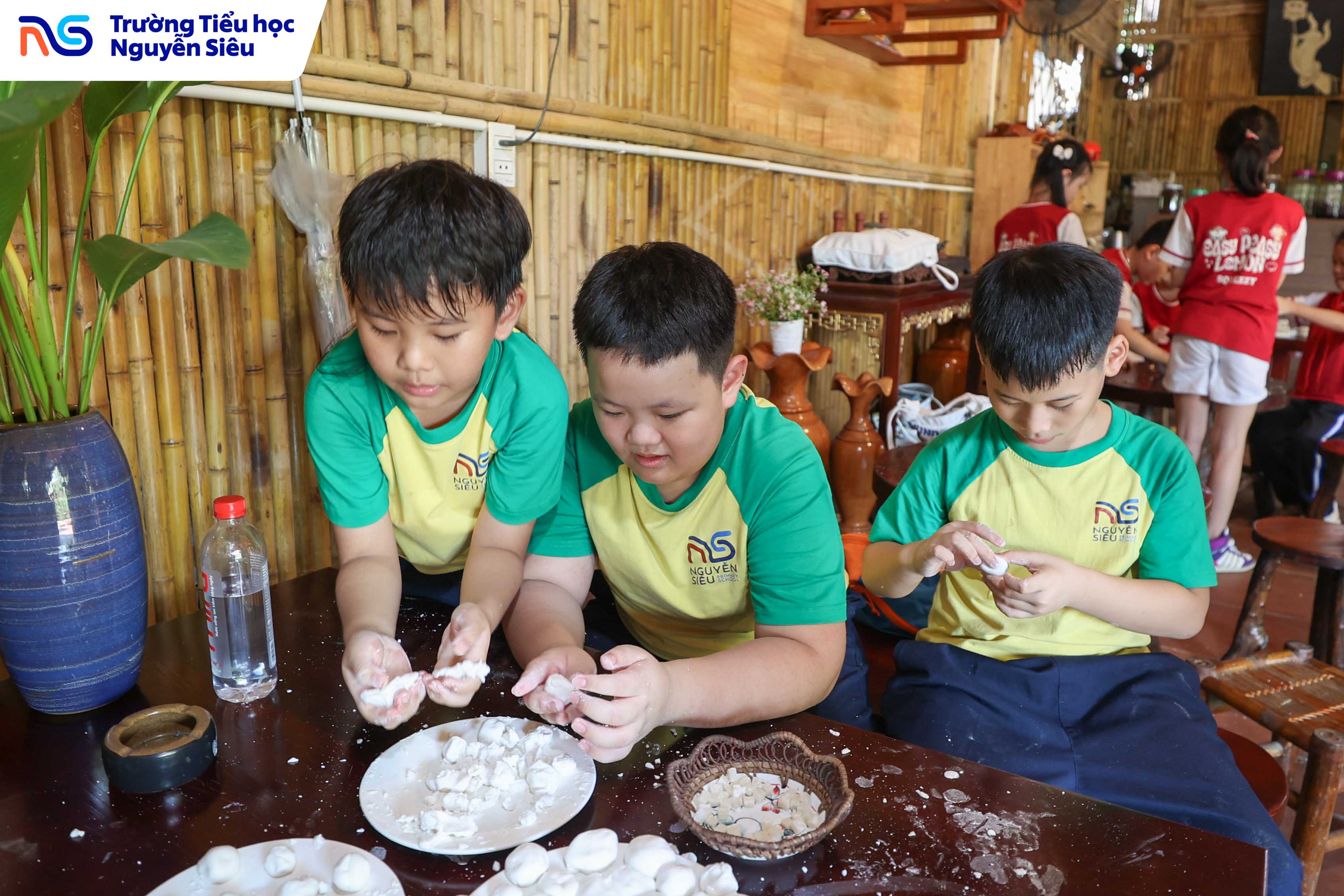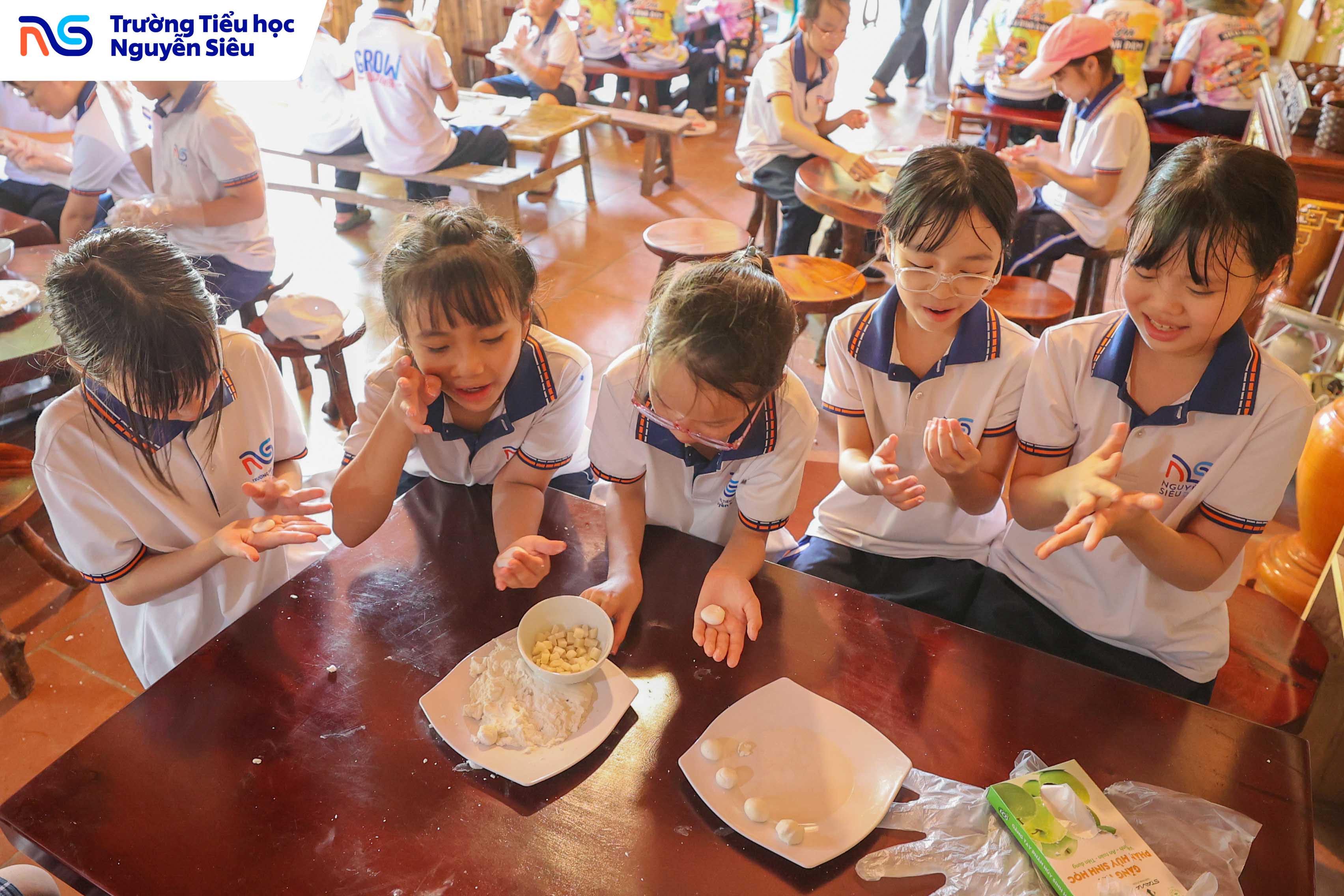 Không chỉ học văn hóa, các con còn được trực tiếp tham gia hoạt động làm bánh trôi, bánh sắn, những món quà quê giản dị mà gắn bó với tuổi thơ của bao thế hệ người Việt. Dưới sự hướng dẫn của các cô làng nghề, từng nhóm học sinh cùng nhau nhào bột, nặn bánh, luộc bánh rồi háo hức chờ đợi thành quả của mình. Tiếng cười, tiếng nói ríu rít vang khắp gian bếp nhỏ, mang lại bầu không khí ấm áp, thân thương như một ngôi nhà lớn. Qua hoạt động ấy, các con không chỉ được rèn luyện sự khéo léo và kiên nhẫn, mà còn học được giá trị của lao động, tinh thần hợp tác và niềm vui khi cùng nhau sáng tạo.