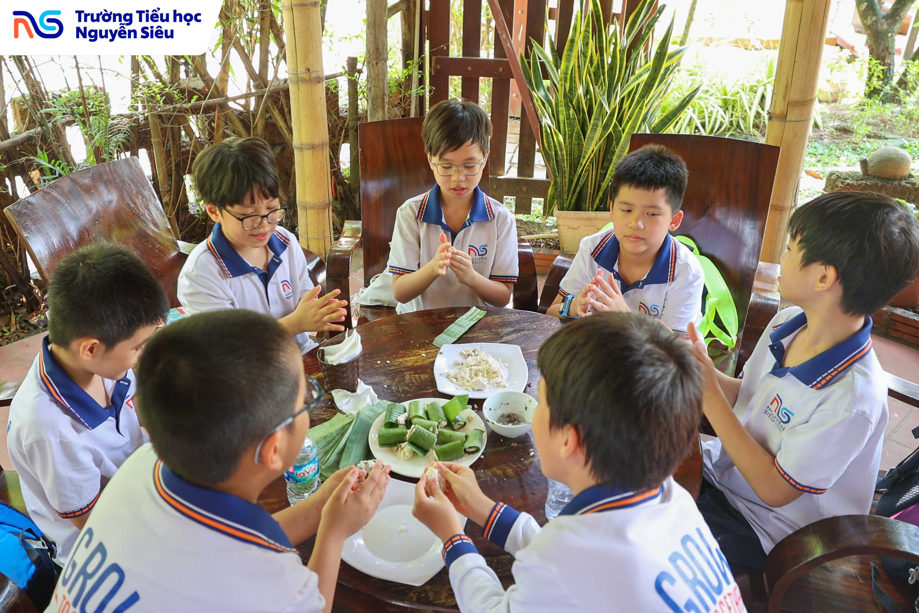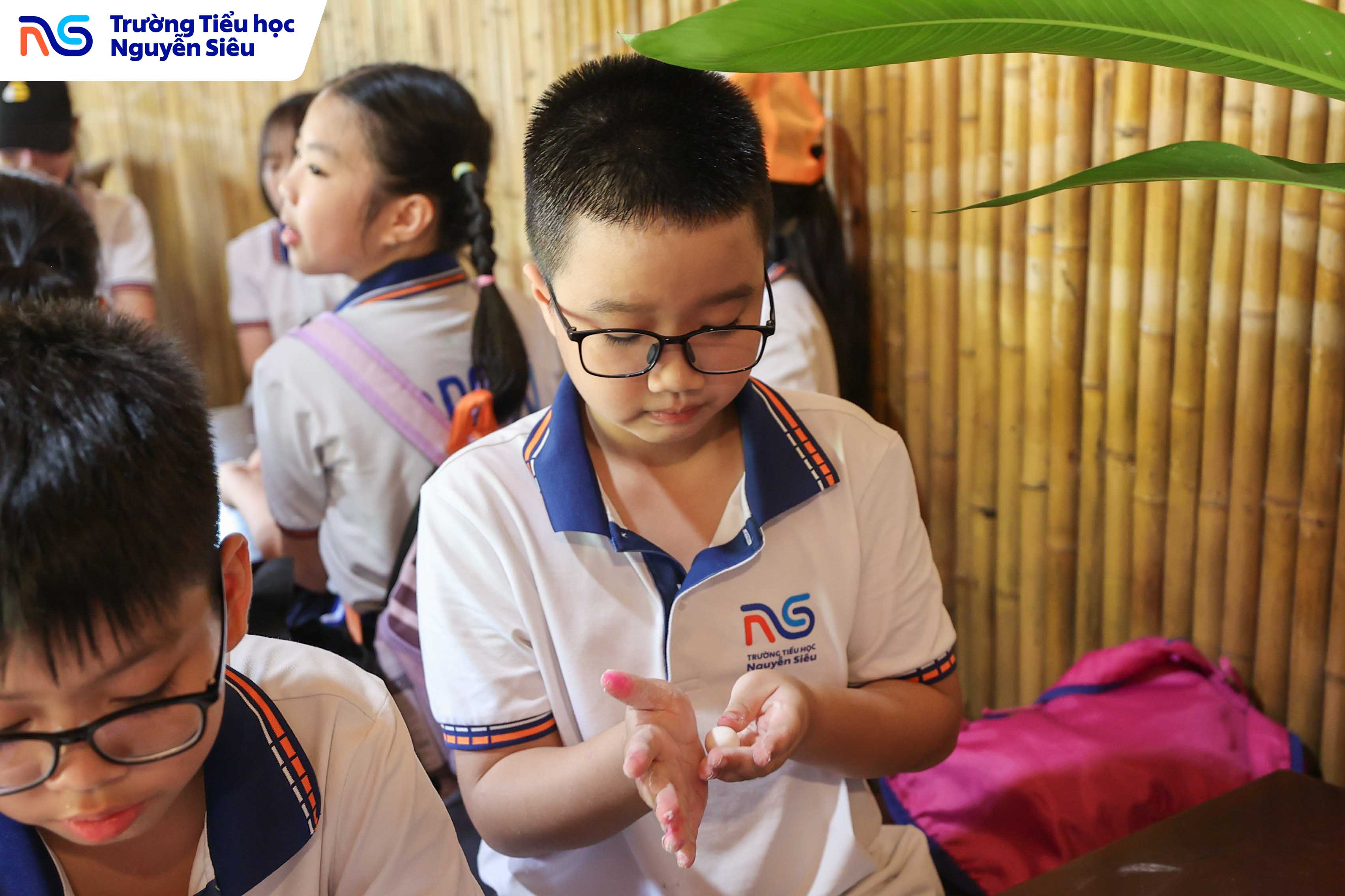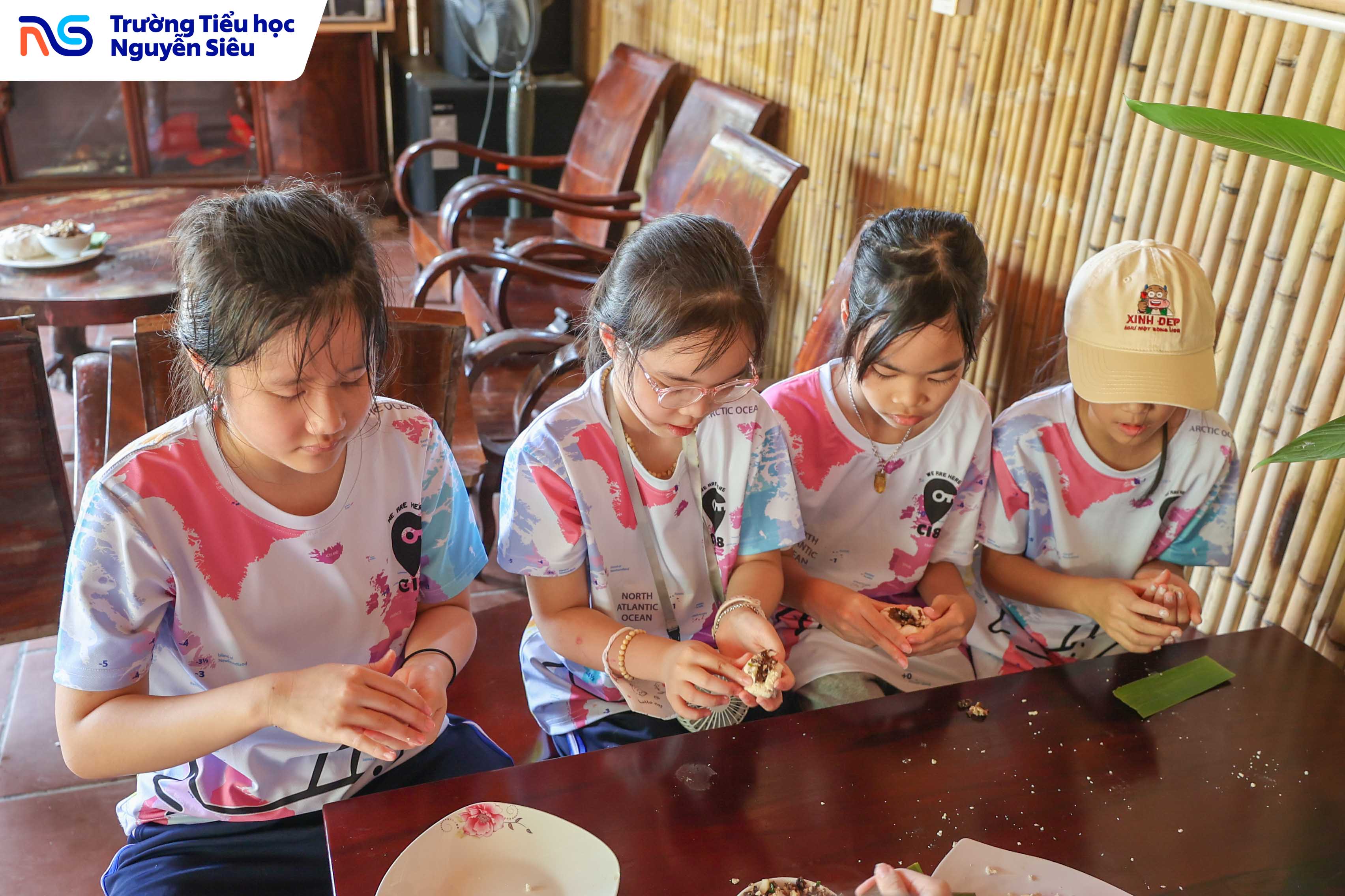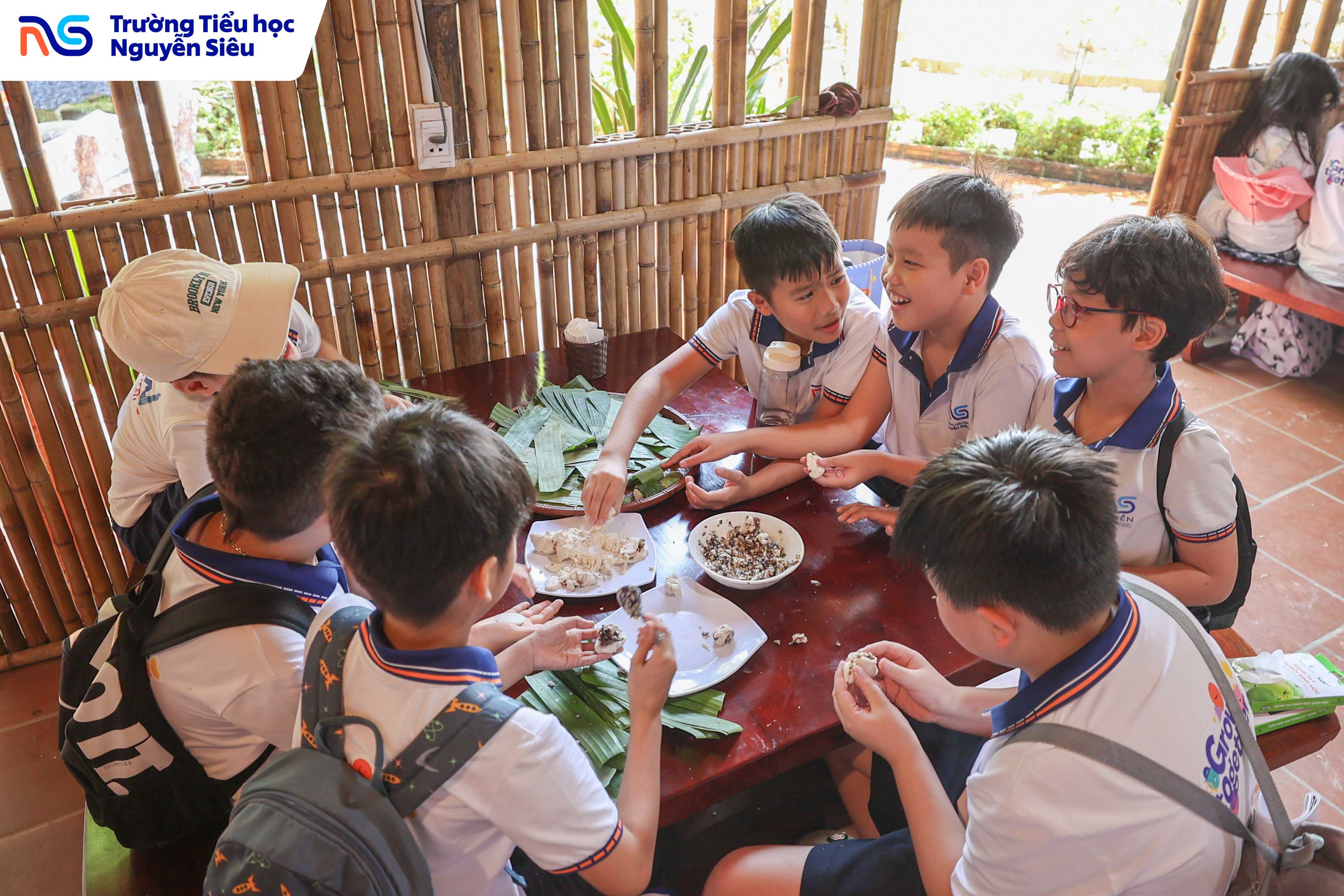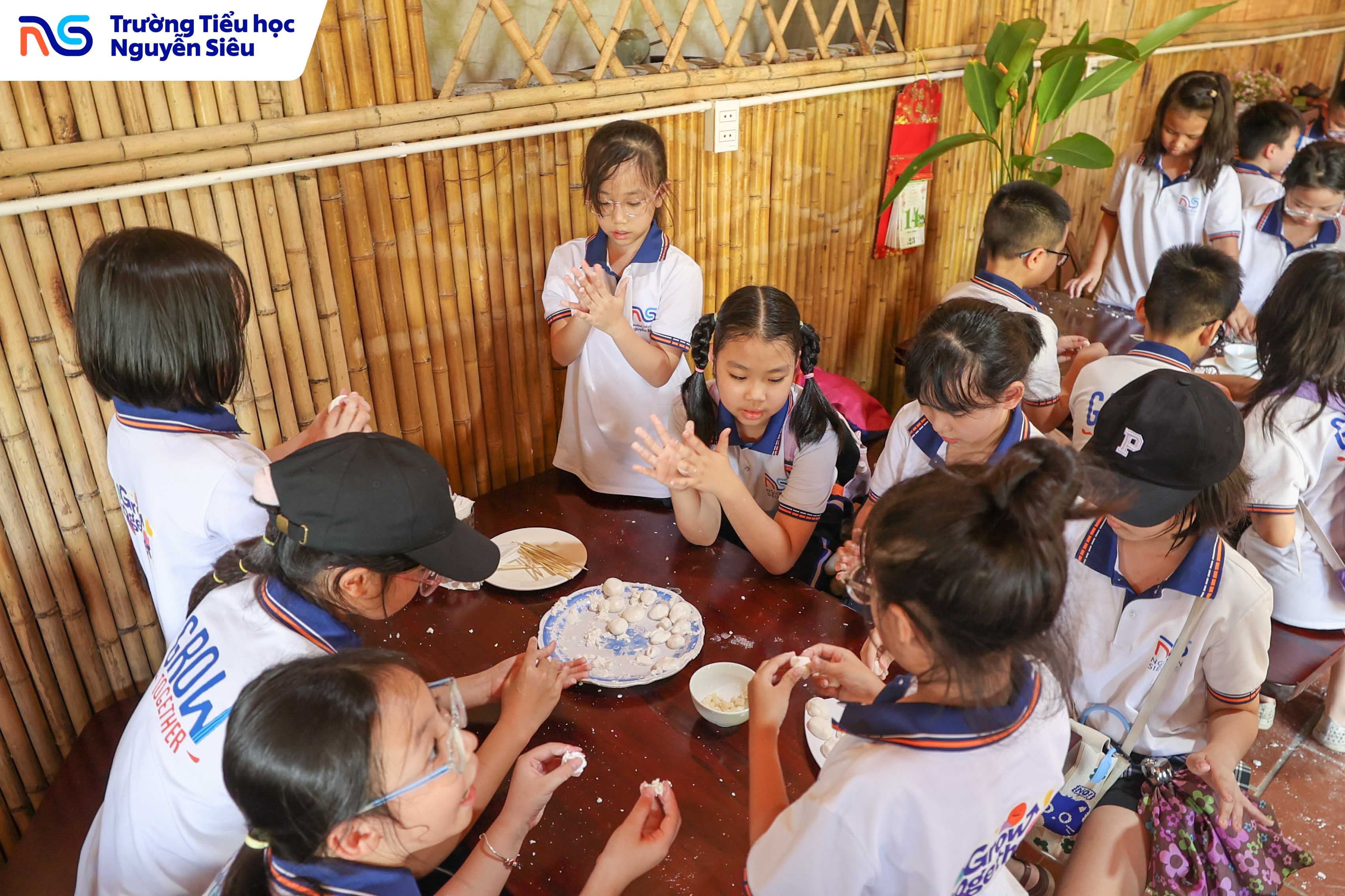 Không chỉ học văn hóa, các con còn được trực tiếp tham gia hoạt động làm bánh trôi, bánh sắn, những món quà quê giản dị mà gắn bó với tuổi thơ của bao thế hệ người Việt. Dưới sự hướng dẫn của các cô làng nghề, từng nhóm học sinh cùng nhau nhào bột, nặn bánh, luộc bánh rồi háo hức chờ đợi thành quả của mình. Tiếng cười, tiếng nói ríu rít vang khắp gian bếp nhỏ, mang lại bầu không khí ấm áp, thân thương như một ngôi nhà lớn. Qua hoạt động ấy, các con không chỉ được rèn luyện sự khéo léo và kiên nhẫn, mà còn học được giá trị của lao động, tinh thần hợp tác và niềm vui khi cùng nhau sáng tạo.